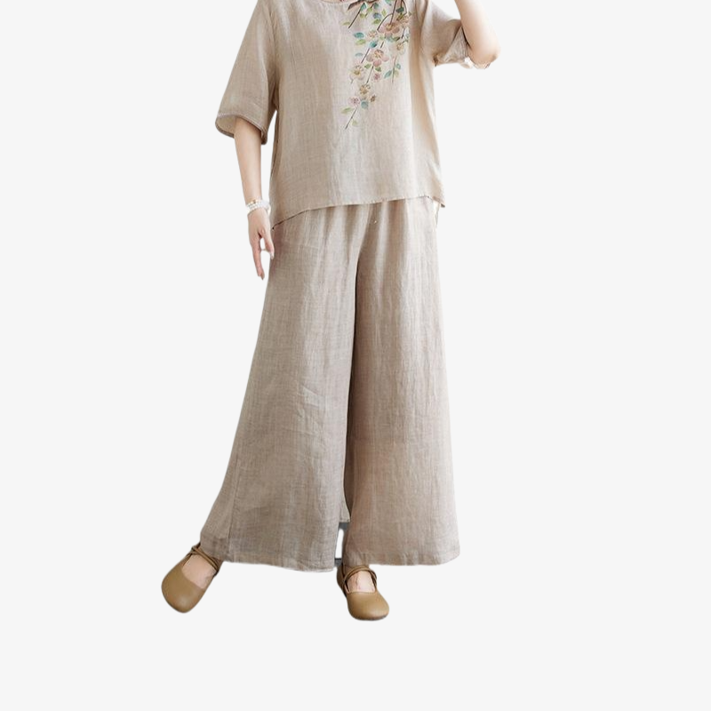 빈티지 프린트 라운드 세트 여 여름 풀오버 린넨 셔츠 얇은 와이드 팬츠 슬림해 보이는 면마 투피스